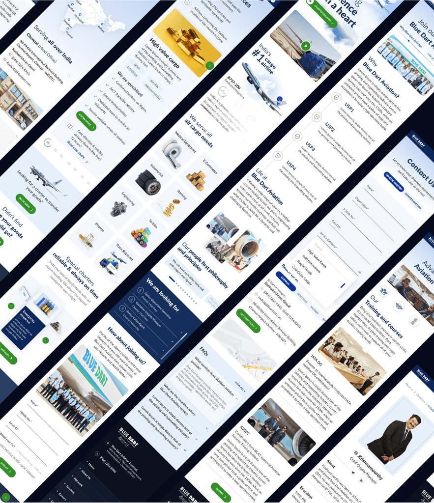 Despite being a leading cargo airline, Blue Dart Aviation previously lacked a dedicated digital presence, relying solely on Blue Dart’s main website for business inquiries. The redesign focused on creating a visually engaging interface and smooth user experience to establish an independent online identity for Blue Dart Aviation. Through clean UX patterns and intuitive navigation, the new platform guides users toward meaningful business interactions, ultimately driving conversions and enhancing the airline’s digital performance.